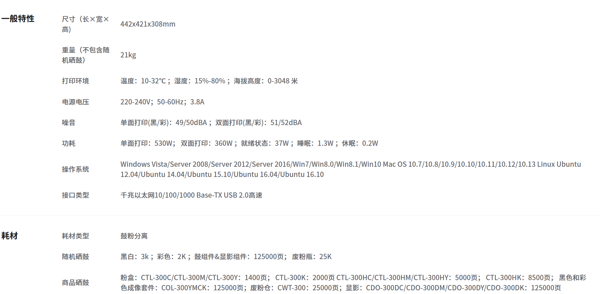 耗材型號  :   粉盒:CTL-300C/CTL-300M/CTL-300Y:1400頁; CTL-300K:2000頁 CTL-300HC/CTL-300HM/CTL-300HY:5000頁; CTL-300HK:8500頁; 黑色和彩色成像套件:COL-300YMCK:125000頁;廢粉倉:CWT-300:25000頁;顯影:CDO-300DC/CDO-300DM/CDO-300DY/CDO-300DK:125000頁