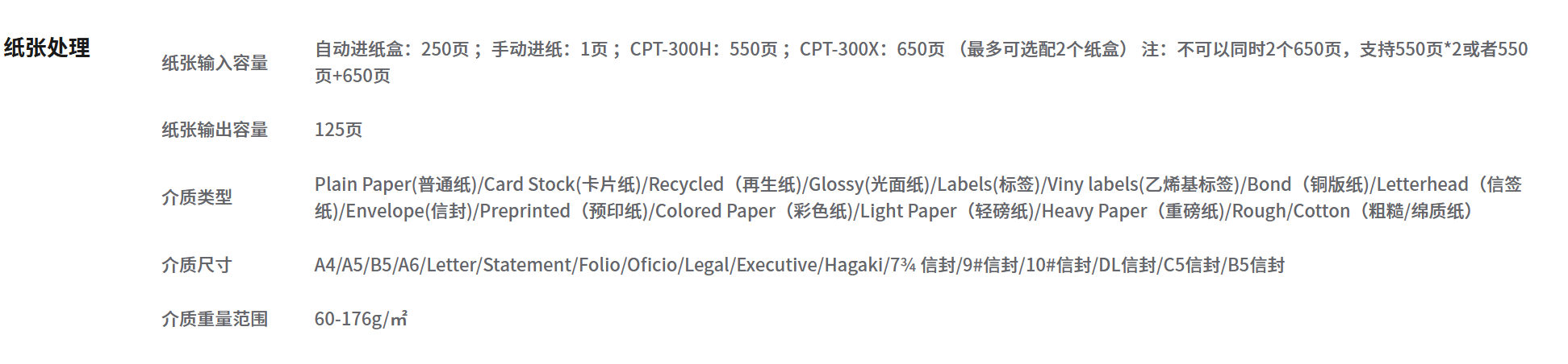 支持介質(zhì)類型  :   Plain Paper(普通紙)/Card Stock(卡片紙)/Recycled(再生紙)/Glossy(光面紙)/Labels(標(biāo)簽)/Viny labels(乙烯基標(biāo)簽)/Bond(銅版紙)/Letterhead(信簽紙)/Envelope(信封)/Preprinted(預(yù)印紙)/Colored Paper(彩色紙)/Light Paper(輕磅紙)/Heavy Paper(重磅紙)/Rough/Cotton(粗糙/綿質(zhì)紙)